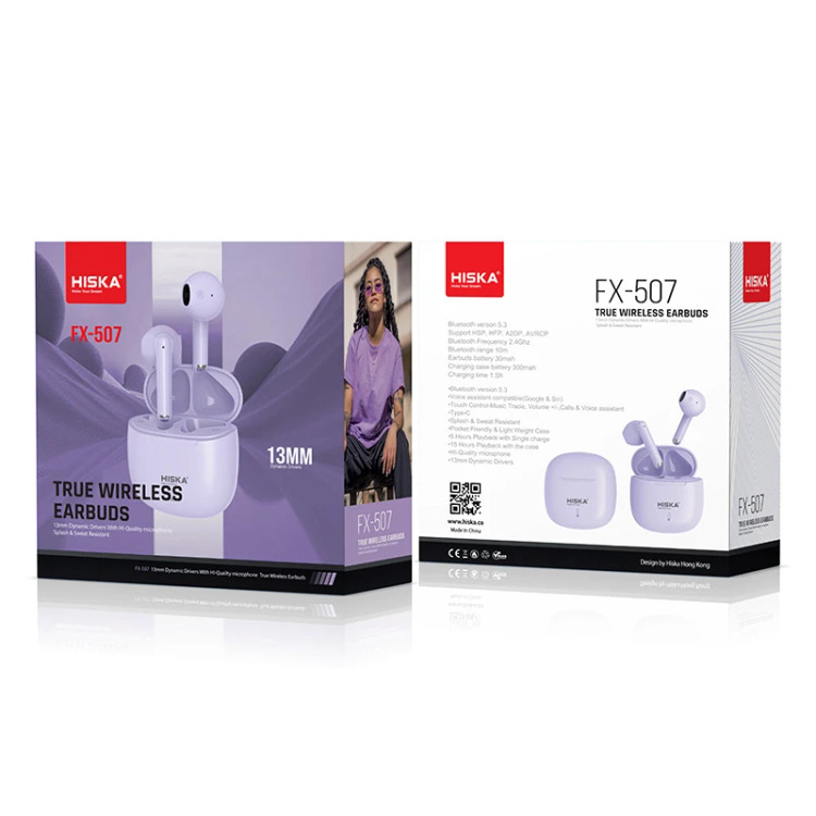 هندزفری بلوتوثی هیسکا مدل FX-507 از سری ایرپاد های کوچک و جمع و جور این برند است که از نوع توگوشی هستند و میزان بیس و قدرت بالا را به کاربران عرضه میکنند. وزن بسیار کم و طراحی ارگونومیک این محصول باعث شده که هنگام استفادهی بلندمدت از آن هیچگونه احساس خستگی یا درد در ناحیهی گوش خود نکنید. قطر درایور این محصول 13 میلیمتر است و محدوده عملکرد آن تا برد 10 متر می باشد. از این هندزفری برای ورزش و کارهای روزمره می توانید استفاده کنید. ایرپاد FX-507 با باتری 300 میلی آمپر ساعتی امکان 4 تا 5 بار شارژ گوشی های ایرپاد را به شما میدهد و برای مکالمه تا 3 ساعت و برای گوش دادن به موسیقی های مورد علاقتون تا 5 ساعت به شما امکان استفاده می دهد. همچنین در جعبه این محصول یک کیف مخملی برای حمل کیس ایرپاد و یک کابل شارژ Type-c قرار داده شده است. و قابلیت جذابی که روی این هندزفری بلوتوثی قرار دارد دستیار صوتی Siri , Google می باشد که شما با لمس چند ثانیه ای گوشی ایرپاد به این دستیار صوتی متصل می شوید.