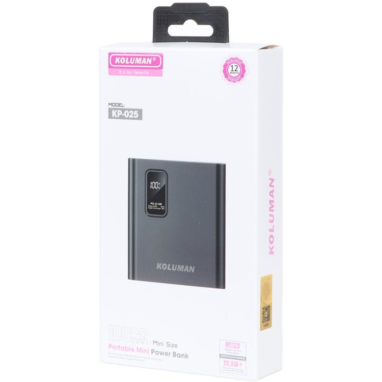 پاوربانک KP-025 تولید شرکت کلومن از یک باتری لیتیومی با ظرفیت 10000 میلی آمپر ساعت بهره میبرد. این پاوربانک 100گرم وزن دارد . با داشتن این پاوربانک دیگر بابت تمامشدن شارژ باتری گوشی موبایل، تبلت، دوربین دیجیتال و لوازمی از این قبیل نگرانی نخواهید داشت؛ زیرا میتوانید در هر شرایطی بدون نیاز به پریز برق، باتری گوشی موبایل یا دیگر لوازم سازگار با این محصول را با یک کابل USB شارژ کنید. در ساخت این دستگاه از تکنولوژی شارژ سریع Quick Charge 3.0 استفاده شده است. پشتیبانی از شارژ سریع به این معنی است که باتری دستگاه شما با کمک این پاوربانک سریعتر از شارژرهای معمولی شارژ خواهد شد. البته باید توجه داشته باشید که تکنولوژی شارژ سریع تنها با دستگاههای دارای استاندارد شارژ سریع سازگار است و در دستگاههای معمولی امکان استفاده از این تکنولوژی وجود ندارد. شدت جریان خروجی در این شارژر همراه با توجه به ولتاژ خروجی آن، متفاوت است. زمانی که ولتاژ خروجی در این محصول 4.5 تا 5 ولت باشد، شدت جریان خروجی 3 تا 5 آمپر است. این در حالی است که اگر ولتاژ خروجی در این محصول 6 تا 9 ولت باشد، شدت جریان خروجی برابر با 2 آمپر خواهد بود. در حالت سوم و زمانی که ولتاژ خروجی 9 تا 12 ولت باشد، شدت جریان خروجی برابر با 1.5 آمپر است. در مورد شدت جریان ورودی این محصول نیز باید بدانید که اگر در حالت عادی ولتاژ ورودی در آن 5 ولت باشد، شدت جریان ورودی2 آمپر خواهد بود و در حالت شارژ سریع (5V ⎓3A) است. شما میتوانید وضعیت شارژ باتری KP-025 را از طریق صفحه نمایشگر LED روی بدنه بررسی کنید.توان کلی این دستگاه تا 22.5 وات میباشد و این دستگاه مجهز به فناوری PD با توان 20وات نیز میباشد. که یکی از قابلیت های بسیار مهم آن میباشد زیرا شما هم میتوانید با این درگاه پاوربانک را شارژ کنید و هم به عنوان خروجی از آن استفاده کنید و دستگاه خود را با آن شارژ کنید. این پاوربانک دارای 3خروجی میباشد .نکته قابل توجه در این دستگاه ابعاد کوچک و وزن بسیار کم آن است که باعث میشود به راحتی در کیف و یا حتی جیب شما قرار بگیرد و به راحتی از آن استفاده کنید